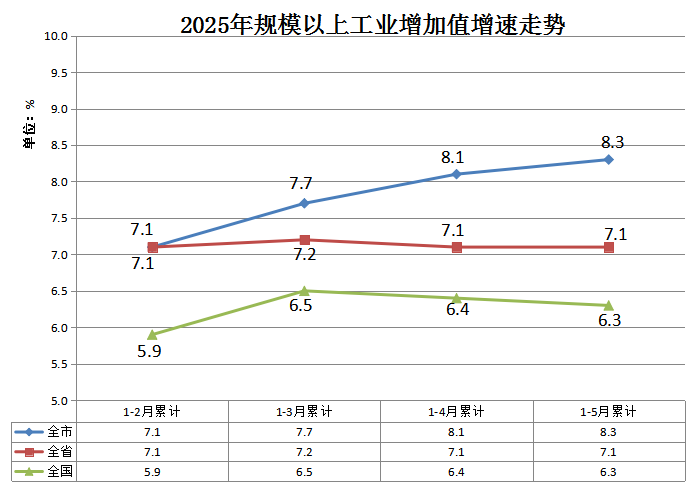2025年1-5月,雅安市规模以上工业增加值同比增长8.3%,分别比全国、全省快2.0个百分点、1.2个百分点,与全国全省比较优势呈逐月持续扩大走势。