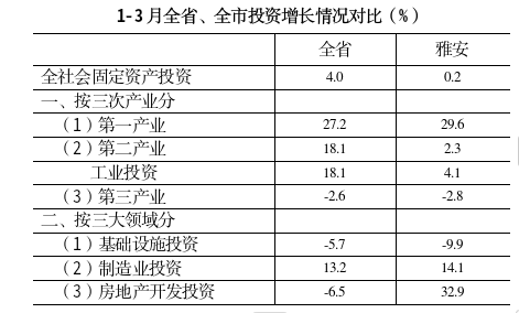 根据四川省统计局最新反馈数据显示,一季度全市固定资产投资同比增长0.2%,增速较1-2月提升7.7个百分点,提升幅度高于全省6.9个百分点。分产业看,第一产业投资增长29.6%,第二产业投资增长2.3%,第三产业投资下降2.8%;分领域看,全市基础设施投资下降9.9%,制造业投资增长14.1%,房地产开发投资增长32.9%。